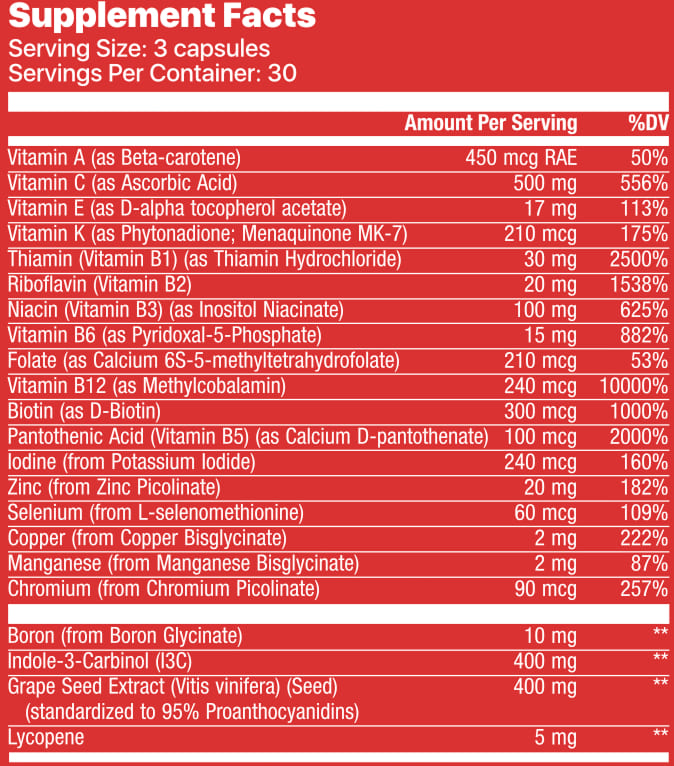 No tiny doses. No unproven ingredients. Just the quality and quantity every guy deserves in a multivitamin.