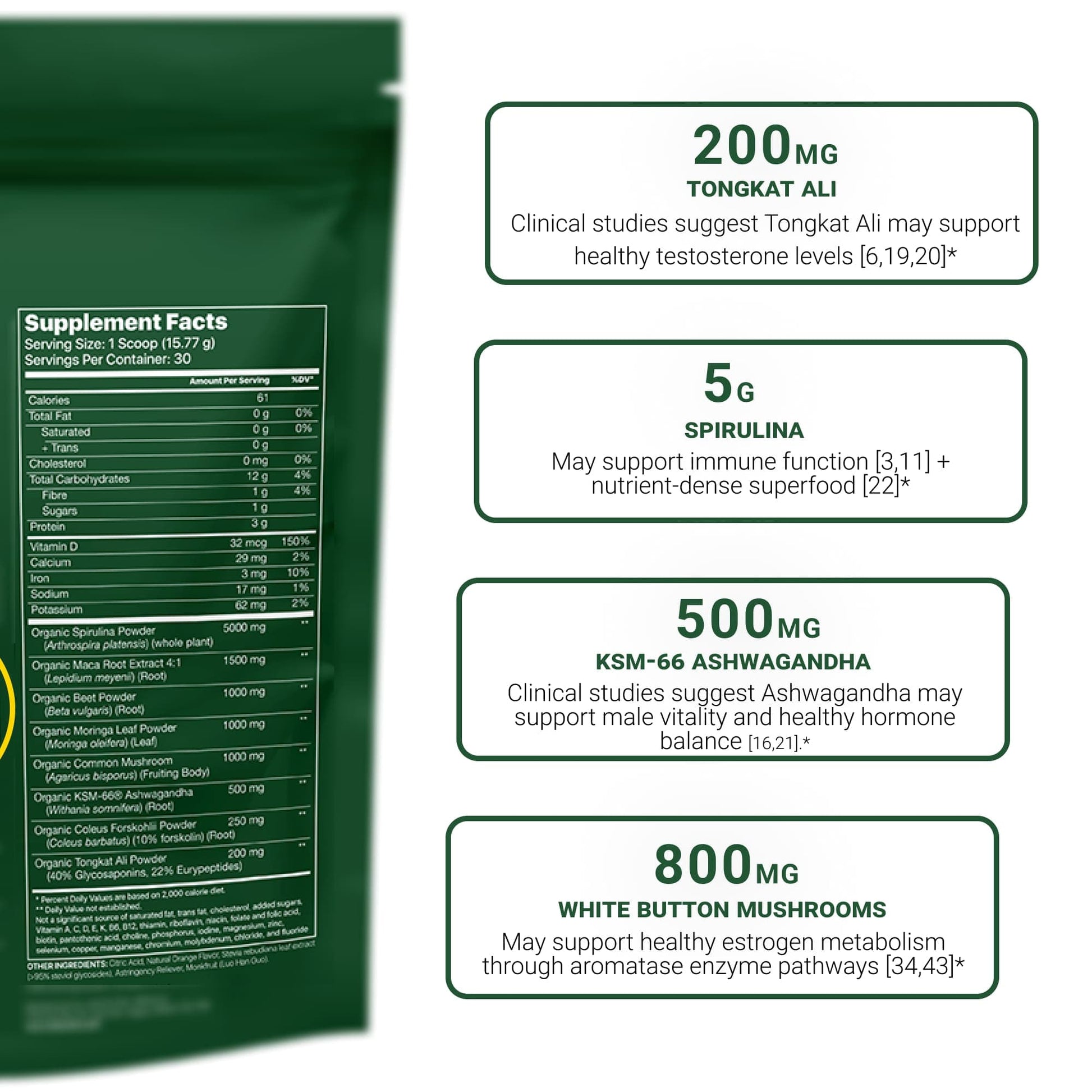 The ONLY Superfood Formulated for Men's Health & Hormones With Fully Effective Doses of Proven Organic Ingredients.